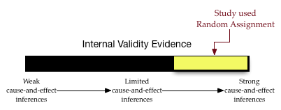 We use the term internal validity to describe the degree to which cause-and-effect inferences are accurate and meaningful. Causal attribution is the goal for many researchers. Thus, by using random assignment we have a pretty high degree of evidence for internal validity; we have a much higher belief in causal inferences. Much like evidence used in a court of law, it is useful to think about validity evidence on a continuum. For example, a visualization of the internal validity evidence for a study that employed random assignment in the design might be: