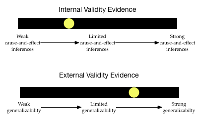 Much like evidence used in a court of law, it is useful to think about validity evidence on a continuum. For example, after reading about the sampling and design of a particular study you might envision the following two “barometers” of the internal and external validity evidence for a study’s inferences: